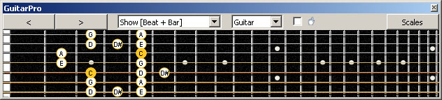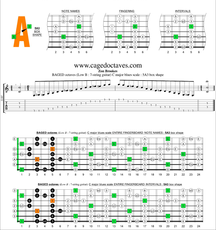 The diagrams that follow show all of the C major blues scale notes plotted over the 7-string guitar' fretboard in the BAGED octaves style:-