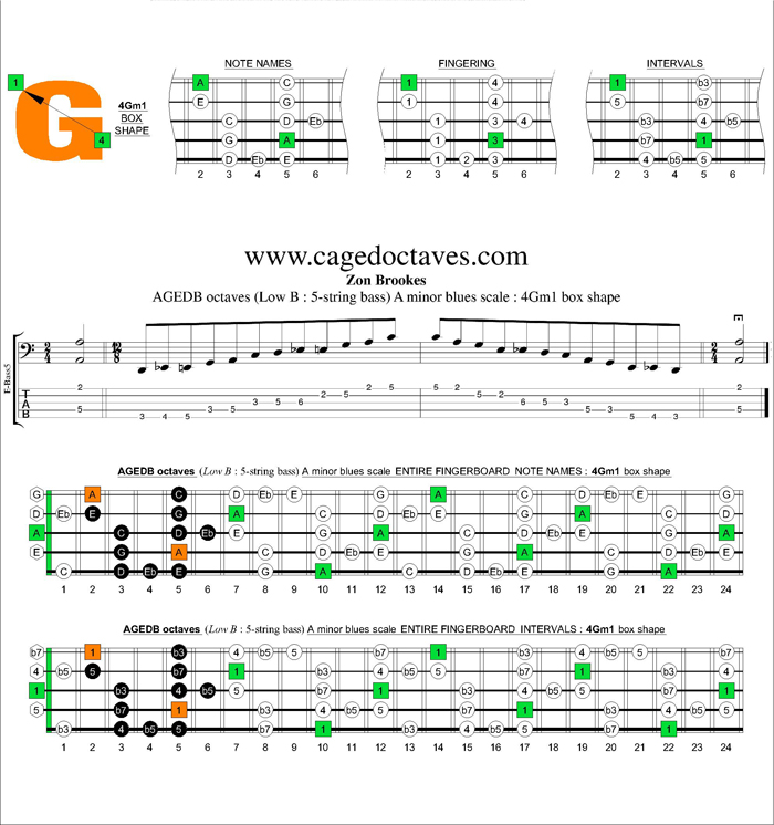 The diagrams that follow show all of the A minor blues scale notes plotted over the 5-string bass' fretboard in the AGEDB octaves and GuitarPro6 styles:-