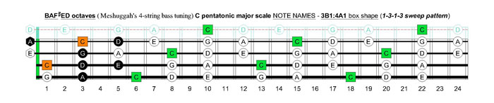 using the BAF♯ED octaves methodology for MESHUGGAH's 4-string bass tuning (F B♭ E♭ A♭).