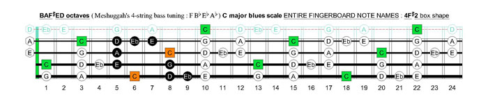 C major blues scale are detailed below in the BAF♯ED octaves manner.